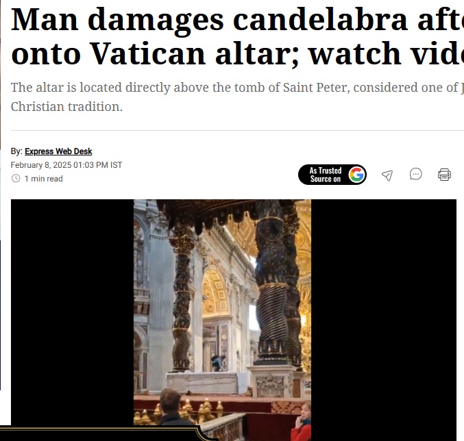 வைரலாகும் வீடியோவைக் கீ-ப்ரேம்களாகப் பிரித்து ரிவர்ஸ் சர்ச் முறைக்கு உள்ளாக்கியபோது கடந்த பிப்ரவரி 08, 2025 அன்று ”Man damages candelabra after jumping onto Vatican altar; watch video” என்கிற தலைப்பில் The Indian Express வெளியிட்டிருந்த செய்தி நமக்குக் கிடைத்தது. அதன்படி, ருமேனியாவைச் சேர்ந்த நபர் ஒருவர் வாடிகன் செயிண்ட் பீட்டர்ஸ் தேவாலயத்தில் நுழைந்து பல ஆயிரம் டாலர்கள் மதிப்புடைய மெழுகுவர்த்தி தாங்கியை சேதப்படுத்தியதாக செய்தி இடம்பெற்றிருந்தது.