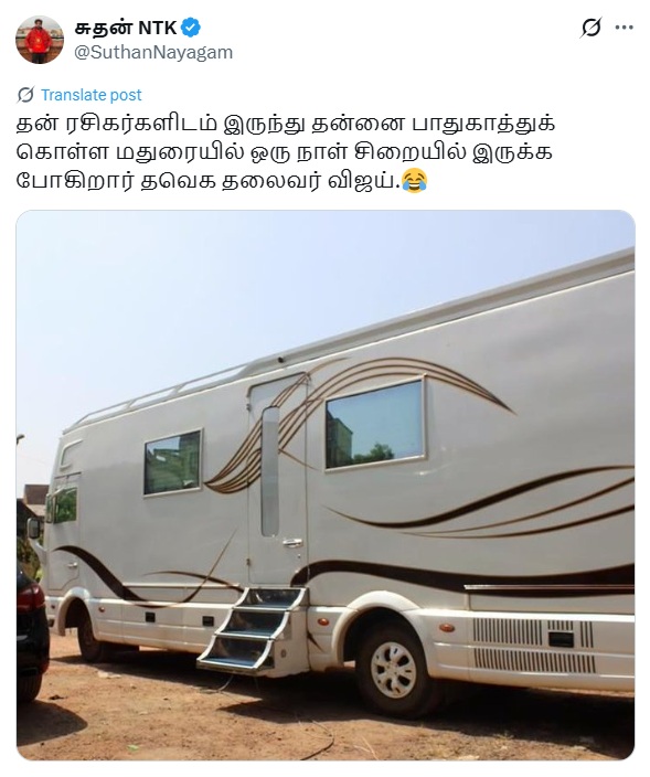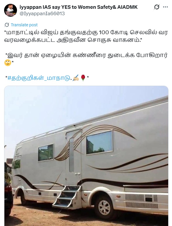 ”மாநாட்டில் விஜய் தங்குவதற்கு 100 கோடி செலவில் வர வரவழைக்கபட்ட அதிநவீன சொகுசு வாகனம். இவர் தான் ஏழையின் கண்ணீரை துடைக்க போகிறார்” என்று இந்த புகைப்படம் பரவுகிறது.