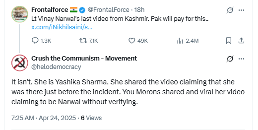 இத்தேடலில் வைரலாகும் இச்செய்தியுடைய வீடியோ ஒன்றின் கீழ் எக்ஸ் பயனர் ஒருவர் வீடியோவில் காணப்படுபவர்கள் வினய் நர்வால் மற்றும் ஹிமான்ஷி நர்வால் தம்பதியினர் இல்லை என்றும், அதிலிருப்பவர் யாஷிகா ஷர்மா என்றும் தெரிவித்திருந்ததை காண முடிந்தது.