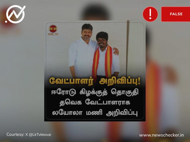 தவெக ஈரோடு கிழக்கு தொகுதி வேட்பாளராக லயோலா மணி என்பவர் அறிவிப்பு என்று பரவும் செய்தி தவறானதாகும்.