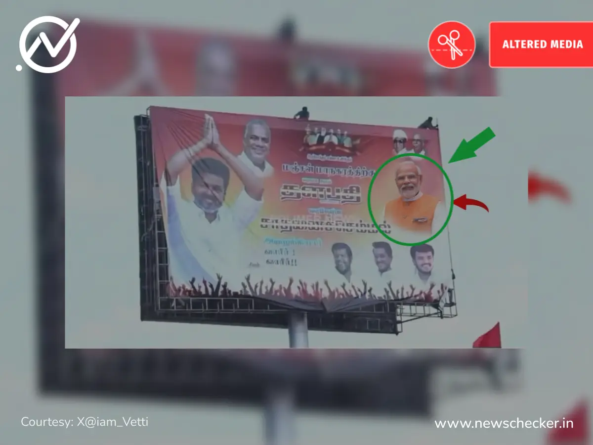 ஈரோடு தவெக மாநாட்டில் பிரதமர் மோடியின் படத்துடன் பேனர் வைக்கப்பட்டுள்ளதாக பரவும் புகைப்படம் எடிட் செய்யப்பட்டு மாற்றப்பட்டதாகும்.