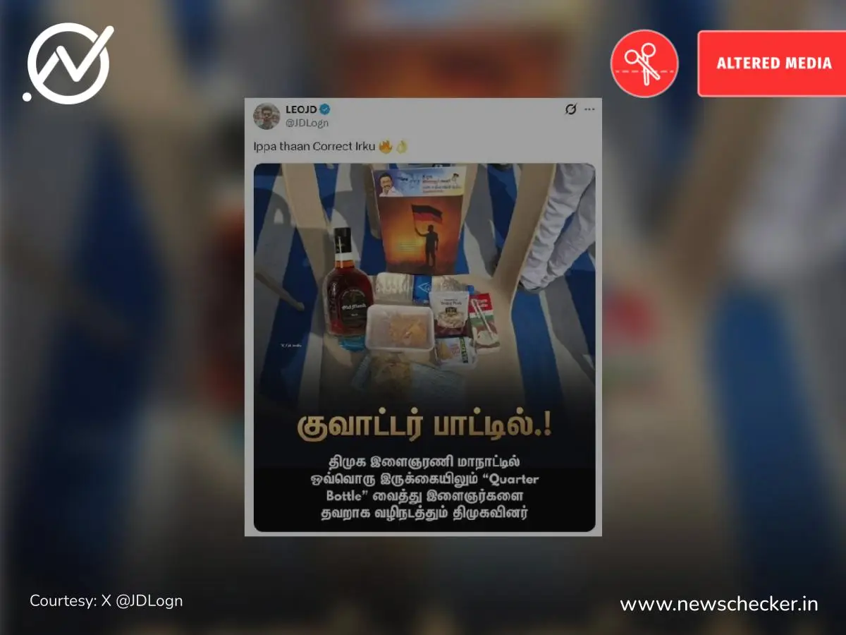 திமுக இளைஞர் அணி மாநாட்டில் வழங்கப்பட்ட பையில் குவாட்டர் பாட்டில் இருந்ததாகப் பரவும் புகைப்படம் எடிட் செய்யப்பட்டதாகும்.