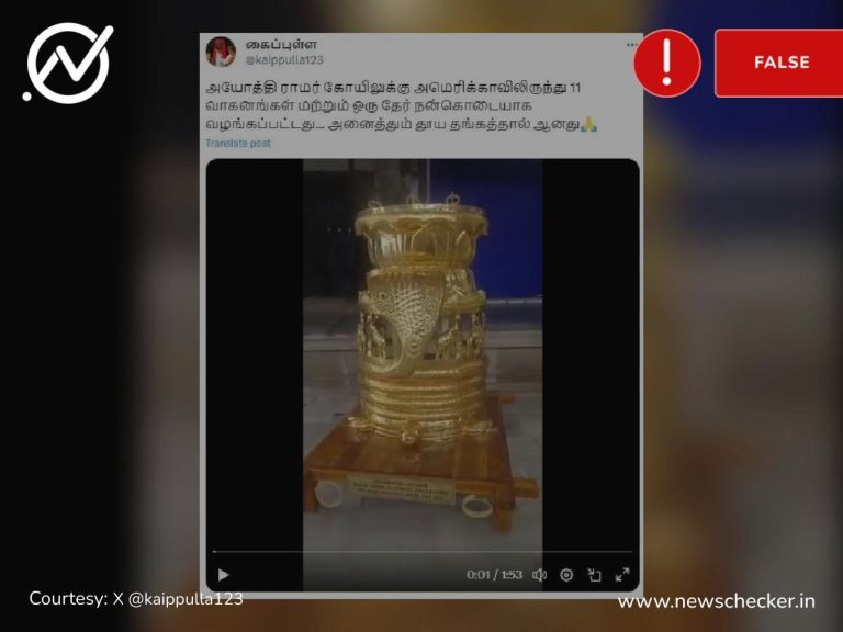 அயோத்தி ராமர் கோயிலுக்கு அமெரிக்காவில் இருந்து வழங்கப்பட்ட தங்க வாகனங்கள் என்று பரவும் வீடியோ தகவல் தவறானதாகும்.
