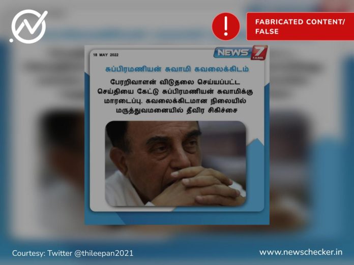 பேரறிவாளன் விடுதலையானதால் சுப்ரமணியன் சுவாமிக்கு மாரடைப்பு ஏற்பட்டுள்ளதாக பரவும் நியூஸ்கார்டு போலியானதாகும்.