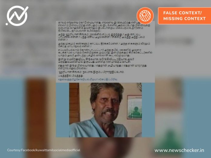 முன்னாள் கிரிக்கெட் வீரர் கபில்தேவ் மெலிந்த உடலுடன் மருத்துவமனையில் மோசமான நிலையில் உள்ளதாகப் பரவுகின்ற புகைப்படம் பழையதாகும்.
