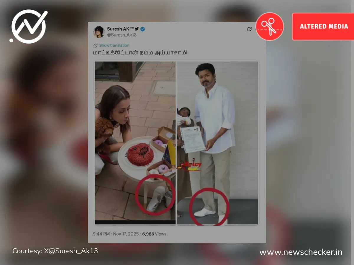 திரிஷாவின் நாய்க்குட்டி பிறந்தநாளில் விஜய் கலந்துக்கொண்டதாக கூறி பரப்பப்படும் புகைப்படம் தவறானதாகும். அப்படம் செயற்கை நுண்ணறிவு மூலம் எடிட் செய்யப்பட்டு மாற்றப்பட்டதாகும்.