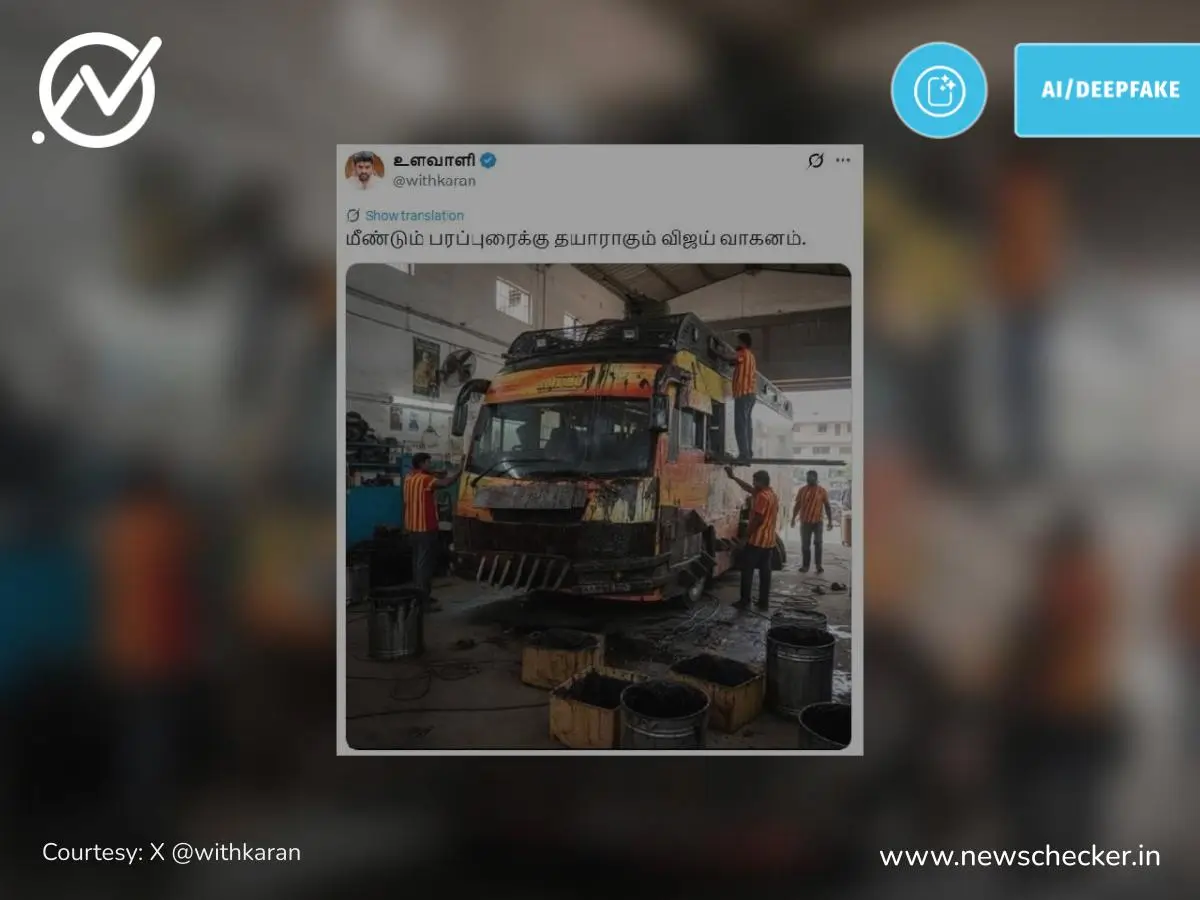 மீண்டும் பரப்புரைக்கு தயாராகும் தவெக தலைவர் விஜயின் வாகனம் என்று பரவும் புகைப்படம் AI மூலமாக எடிட் செய்யப்பட்டதாகும்.