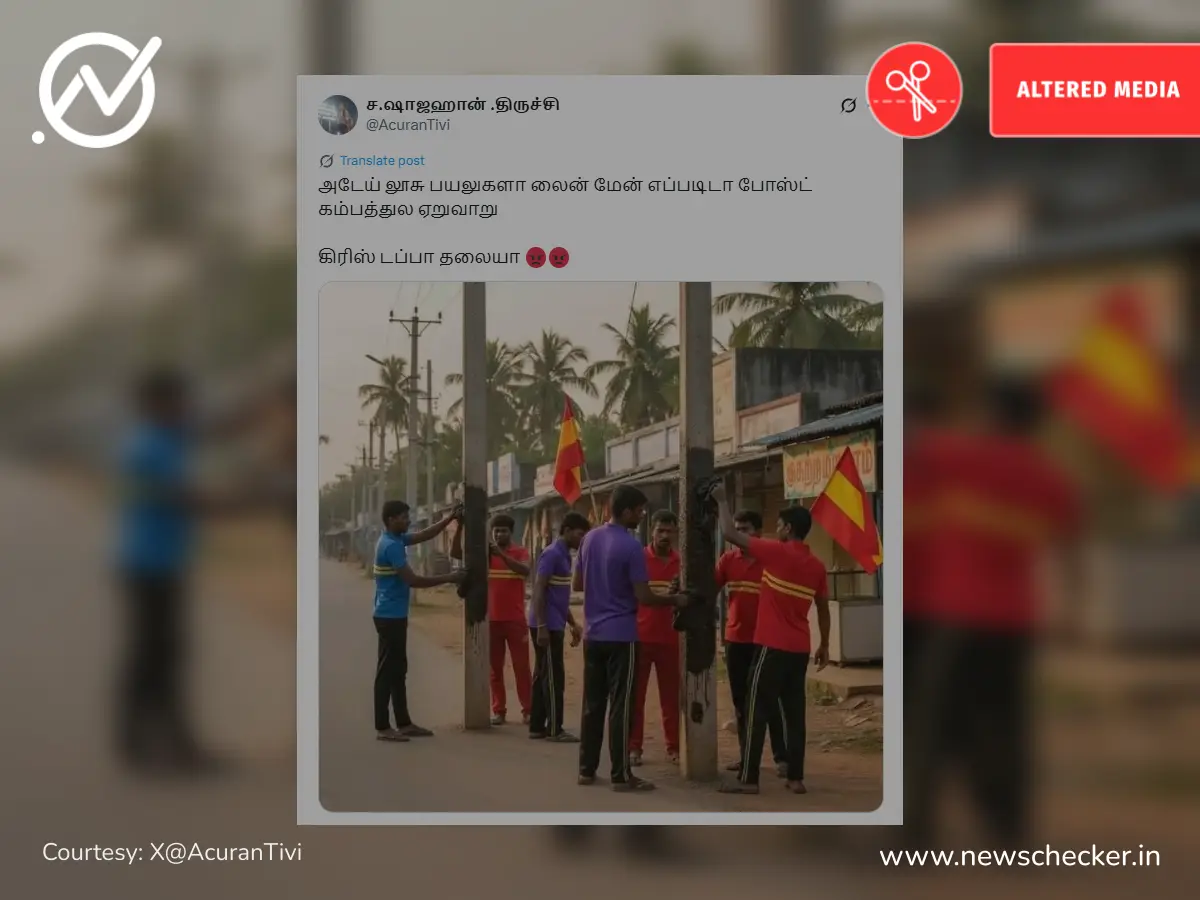 தவெக தொண்டர்கள் மின்கம்பத்தில் கிரீஸ் பூசியதாக பரவும் படம் எடிட் செய்யப்பட்டதாகும்.