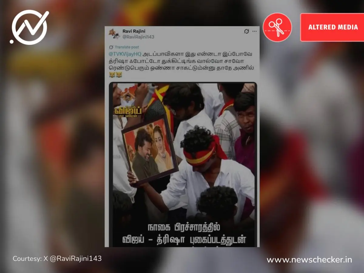நாகை தவெக பிரச்சாரத்தில் விஜய்-த்ரிஷா புகைப்படத்துடன் தவெக தொண்டர்கள் என்று பரவும் நியூஸ்கார்ட் எடிட் செய்யப்பட்டதாகும்.