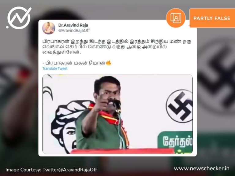 பிரபாகரன் இறந்த இடத்திலிருந்த மண்ணை சேமித்து வைத்துள்ளேன் என்று சீமான் கூறியதாக பரவும் தகவல் தவறானது.