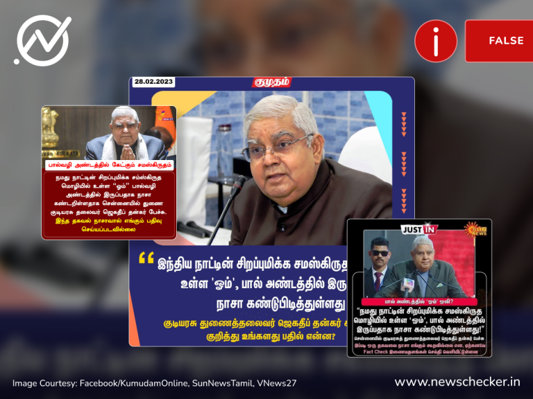 பால்வெளி அண்டத்தில் சமஸ்கிருத ஓம் என்கிற ஒலி இருப்பதை நாசா கண்டுபிடித்துள்ளது என்று ஐஐடி மெட்ராஸில் துணைக்குடியரசுத்தலைவர் ஜெகதீப் தன்கர் பேசியதாகப் பரவுகின்ற செய்தி தவறானதாகும்.