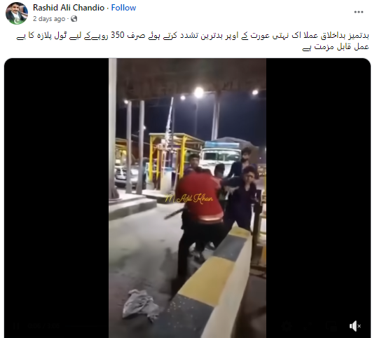 ٹول پلازہ پر مارپیٹ کی ویڈیو سوشل نٹورکنگ سائٹس فیس بک اور ایکس پر شیئر کئے جا رہے ہیں، جس میں ٹول پلازہ کے ملازمین خاتون اور ایک شخص پر تشدد کرتے ہوئے نظر آ رہے ہیں۔ صارفین ویڈیو کو پاکستان کے مٖختلف شہروں کے ٹول پلازہ پر ہوئے مار پیٹ کے واقعے کا بتاکر شیئر کر رہے ہیں۔ کچھ صارفین ویڈیو کو ‘ہائی وے ٹول پلازہ’ لکھ کر شیئر کر رہے، لیکن کمنٹ میں اسے پاکستان کا معاملہ بتا یا جا رہا ہے۔