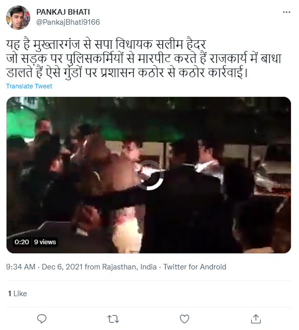 سوشل میڈیا پر پولس کی پٹائی کا ایک ویڈیو شیئر کیا جا رہا ہے۔ جس کے ساتھ صارفین دعویٰ کر رہے ہیں کہ “مختارگنج سے سماج وادی پارٹی کے ایم ایل اے سلیم حیدر نے بیچ سڑک پر ایک پولس ملازم کی پٹائی کی”۔