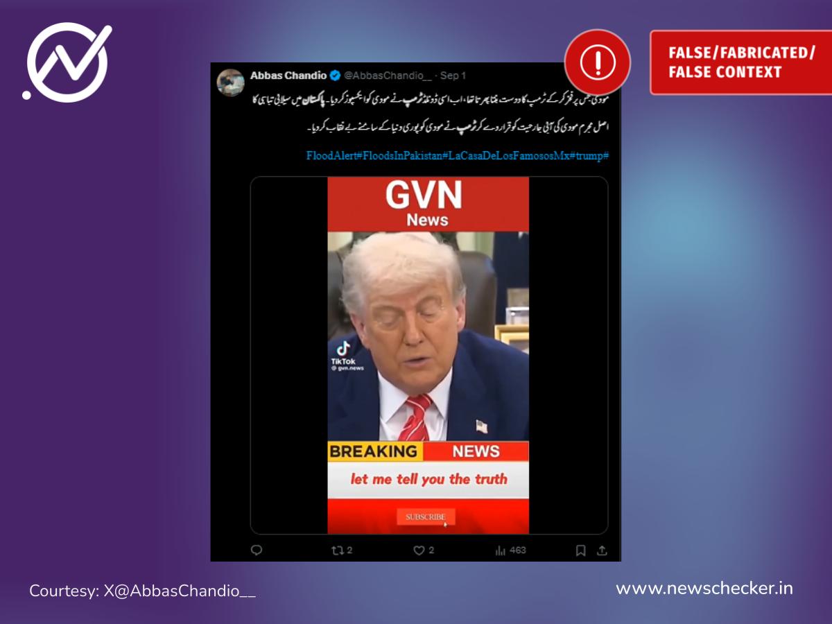 سوشل میڈیا پر ایک ویڈیو کے ساتھ دعویٰ کیا گیا کہ ڈونلڈ ٹرمپ نے اپنے بیان میں پاکستان میں آنے والے سیلاب کا ذمہ دار بھارت کو ٹھہرایا ہے، لیکن تحقیق سے پتا چلا کہ یہ دعویٰ حقیقت پر مبنی نہیں ہے۔ وائرل ویڈیو دراصل مصنوعی ذہانت (اے آئی) کی مدد سے تیار کی گئی ہے۔ یہاں پڑھیں پوری پڑتال۔