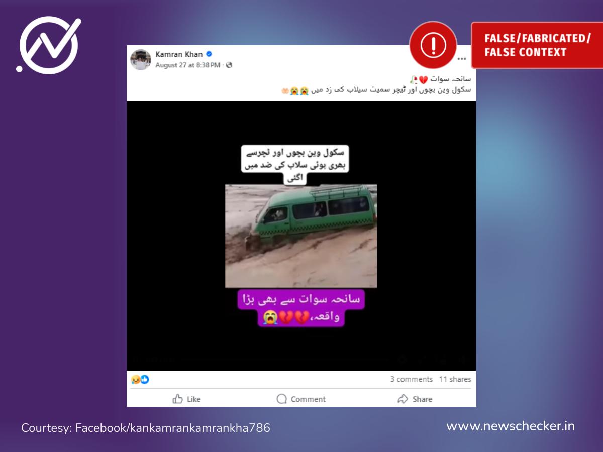 سوشل میڈیا پر ایک ویڈیو کے ساتھ دعویٰ کیا گیا کہ پاکستان کے سوات میں ہرے رنگ کی ایک اسکول وین بچوں اور ٹیچر سمیت سیلاب کی زد میں آ گئی، تاہم تحقیق سے پتا چلا کہ یہ دعویٰ درست نہیں ہے۔ یہ ویڈیو دراصل پرانی ہے اور اس کا تعلق ایران کے خراسان علاقے میں پیش آنے والے ایک حادثے سے ہے، جسے اب غلط طور پر پاکستان کے حالیہ سیلاب سے جوڑ کر شیئر کیا جا رہا ہے۔ پوری تحقیقات یہاں پڑھیں۔