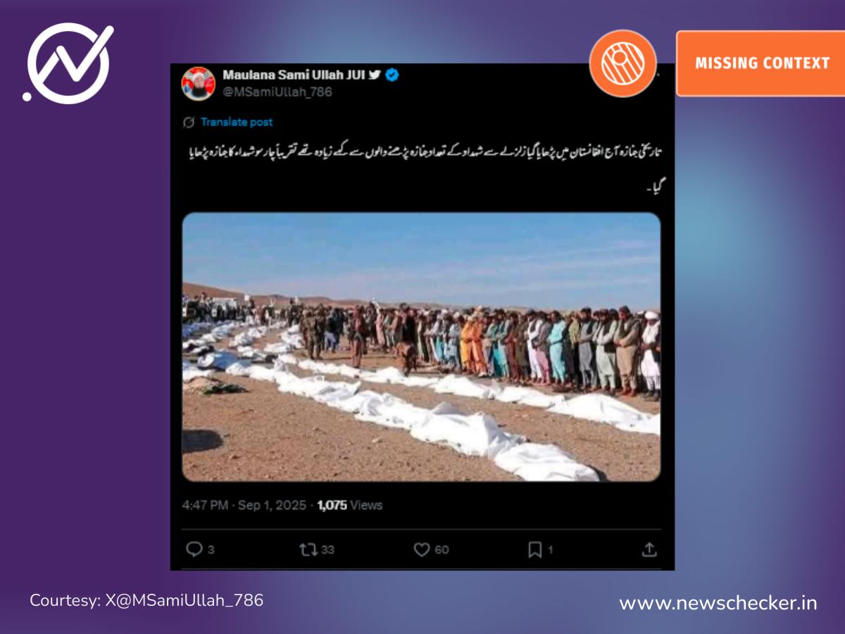 سوشل میڈیا پر گردش کرنے والی تصویر کے بارے میں یہ دعویٰ کیا گیا کہ یہ حالیہ افغانستان زلزلے میں جاں بحق ہونے والے افراد کے اجتماعی جنازے کی ہے۔ تاہم تحقیق سے معلوم ہوا کہ یہ دعویٰ درست نہیں۔ یہ تصویر دراصل 9 اکتوبر 2023 کی ہے اور اُس وقت افغانستان کے صوبہ ہرات میں آنے والے ایک زلزلے کے بعد بڑے پیمانے پر ادا کئے گئے اجتماعی جنازے کی ہے۔ پورا فیکٹ چیک یہاں پڑھیں۔