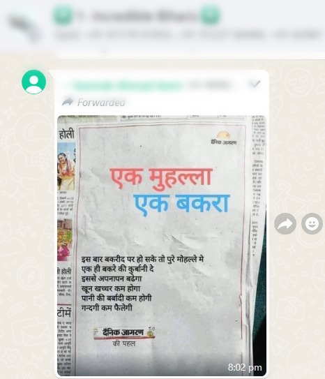 سوشل نٹورکنگ سائٹس فیس بک اور واہٹس ایپ پر دینک جاگرن کے ایک اشتہار کی کٹنگ وائرل ہور ہی ہے۔ جس میں ایک محلہ ایک بکرا بڑے حروف میں لکھا ہوا ہے، اس کے نیچے، اس بار بقرعید پر ہوسکے تو پورے محلے میں ایک ہی بکرے کی قربانی دیں، اس سے اپناپن بڑھےگا، خون خچر کم ہوگا، پانی کی بربادی کم ہوگی، گندگی کم پھیلے گی۔