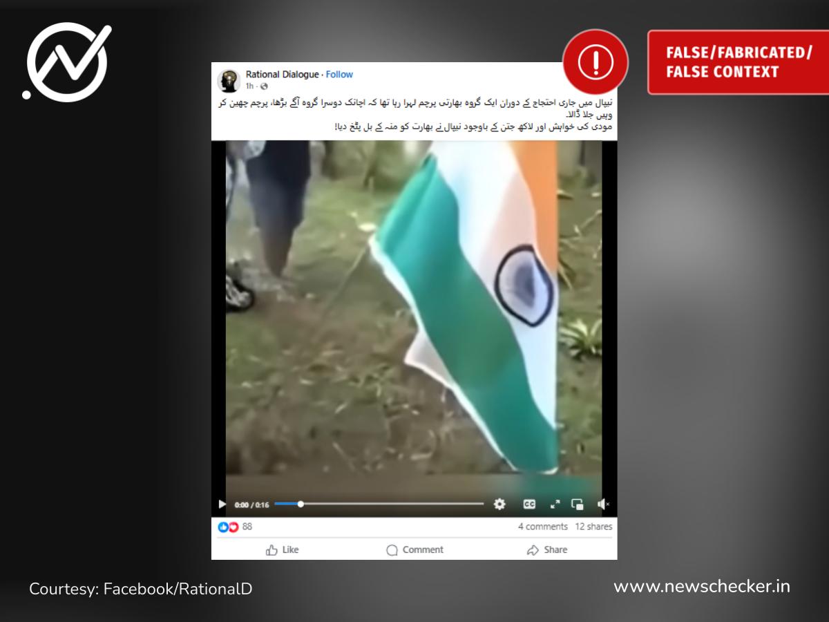 سوشل میڈیا پر ایک ویڈیو شیئر کی گئی، جس کے بارے میں دعویٰ کیا جا رہا ہے کہ یہ نیپال میں جاری حالیہ “جین زی احتجاج” کی ہے، جہاں بھارتی قومی پرچم کو نذر آتش کیا گیا۔ لیکن تحقیق سے پتہ چلتا ہے کہ یہ دعویٰ درست نہیں۔ دراصل وائرل ویڈیو نئی نہیں بلکہ تقریباً تین برس پرانی ہے، جسے حالیہ احتجاج سے جوڑ کر غلط تاثر دینے کی کوشش کی جا رہی ہے۔ مکمل تحقیقات یہاں پڑھیں۔