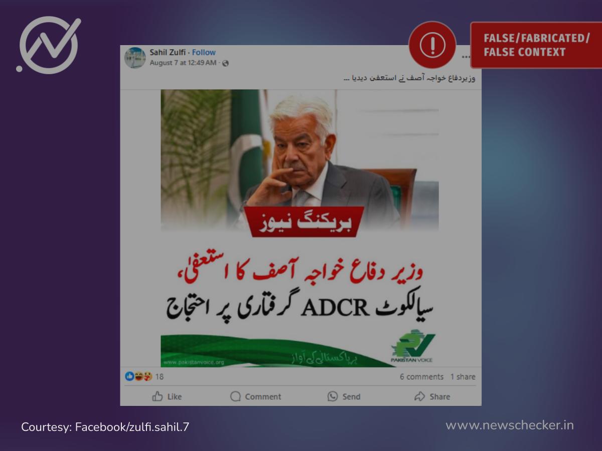 سوشل میڈیا پر ایک پوسٹ میں دعویٰ کیا گیا کہ پاکستان کے وزیر دفاع خواجہ آصف نے اپنے عہدے سے استعفیٰ دے دیا ہے۔لیکن تحقیقات سے معلوم ہوا دعویٰ بے بنیاد ہے،خواجہ آصف نے خود اپنے بیان میں اس کی تردید کی ہے۔ مکمل فیکٹ چیک یہاں پڑھیں۔