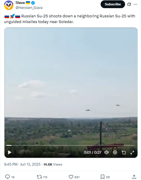 ایران کی جانب سے اسرائیل کے 2 جنگی طیاروں کو مار گرانے کا بتاکر شیئر کی گئی ویڈیو کے ایک فریم کو گوگل لینس کی مدد سے تلاش کیا۔ اس دوران ہمیں سلاوا نامی ایکس ہینڈل پر 13 جون 2025 کو شیئر شدہ ہوبہو ویڈیو موصول ہوئی۔ جس کے ساتھ انگلش زبان میں کیپشن موجود ہے، جس کا اردو ترجمہ ہے “روسی ایس یو-25 نے سولیدار کے قریب ایک ہمسایہ روسی ایس یو-25 کو غیر گائیڈڈ میزائلوں سے مار گرایا”۔