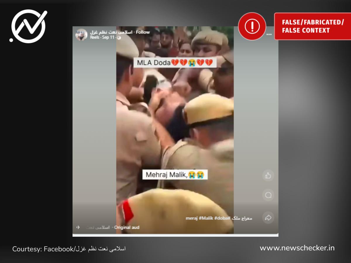 سوشل میڈیا پر وائرل ایک ویڈیو کے سلسلے میں دعویٰ کیا گیا کہ اس میں ڈوڈہ کے ایم ایل اے معراج ملک کو پولس نے پرتشدد انداز میں گرفتار کیا ہے، لیکن تحقیق سے پتا چلا کہ یہ دعویٰ گمراہ کن ہے۔ دراصل ویڈیو دہلی کی ہے جہاں آوارہ کتوں کے حق میں احتجاج کرنے والے مظاہرین کو پولس نے حراست میں لیا تھا، اور اس کا معراج ملک یا ڈوڈہ واقعے سے کوئی تعلق نہیں ہے۔ پوری تحقیقات یہاں پڑھیں۔