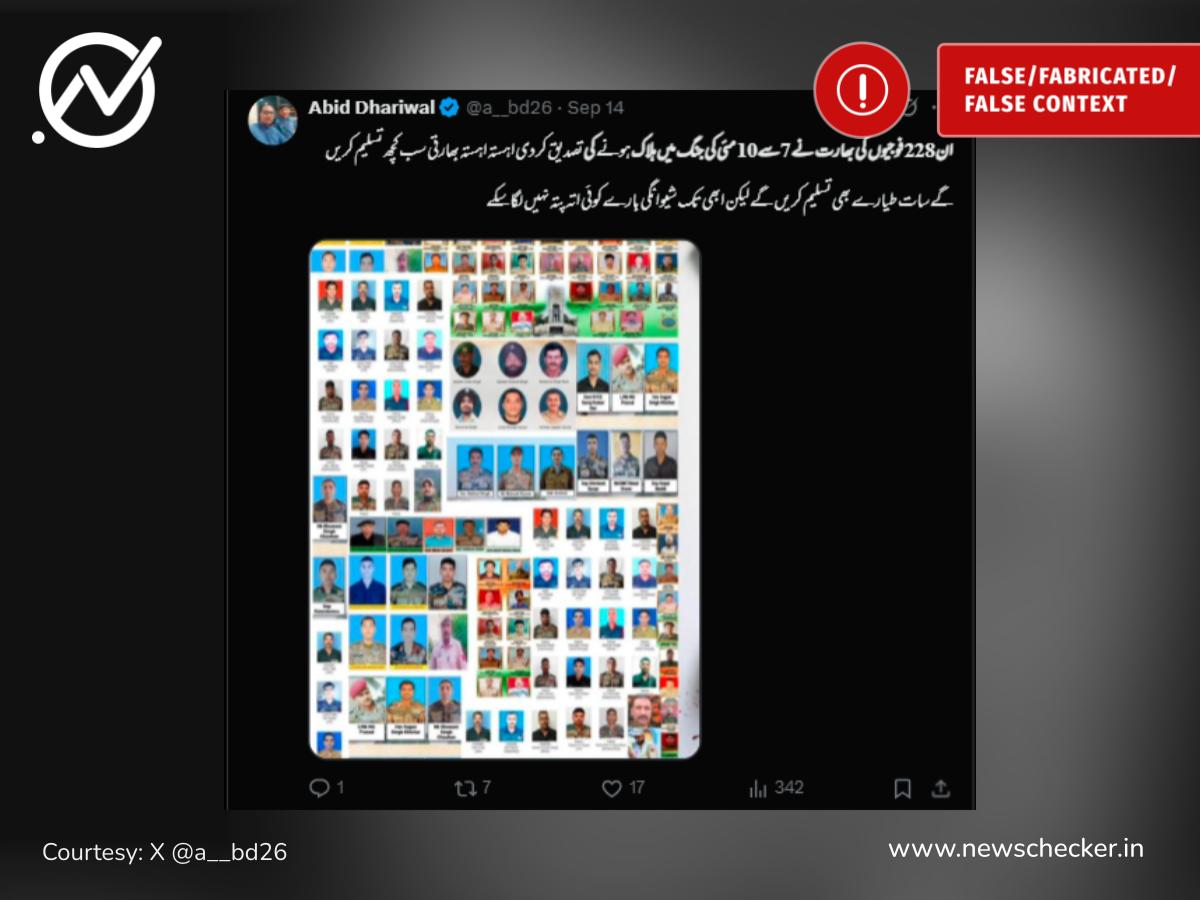 سوشل میڈیا پر یہ دعویٰ کیا گیا کہ بھارت نے 228 فوجیوں کی تصاویر جاری کی ہیں جو مبینہ طور پر 7 سے 10 مئی کی پاک-بھارت تنازعہ کے دوران شہید ہوئے تھے، لیکن تحقیقات سے واضح ہوا کہ یہ دعویٰ جھوٹا ہے۔ دراصل وائرل کولاج میں شامل تصاویر مختلف سانحات جیسے پلوامہ حملہ، اروناچل پردیش حادثہ، سکم فلیش فلڈ اور دیگر مواقع پر شہید ہونے والے بھارتی فوجیوں کی ہیں۔ مکمل فیکٹ چیک یہاں پڑھیں۔