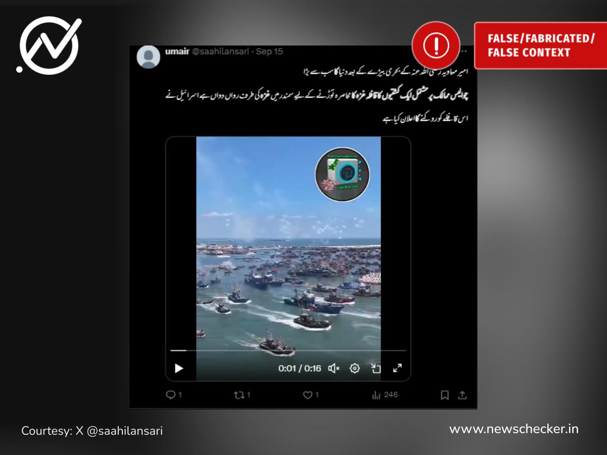 سوشل میڈیا پر ایک ویڈیو کے ساتھ دعویٰ کیا گیا کہ یہ منظر 44 ممالک کے بحری بیڑوں کے غزہ کے لئے روانہ ہونے کا ہے، لیکن تحقیقات سے پتا چلا کہ یہ دعویٰ بے بنیاد ہے اور یہ ویڈیو چین کی ہے۔ پوری تحقیقات یہاں پڑھیں۔