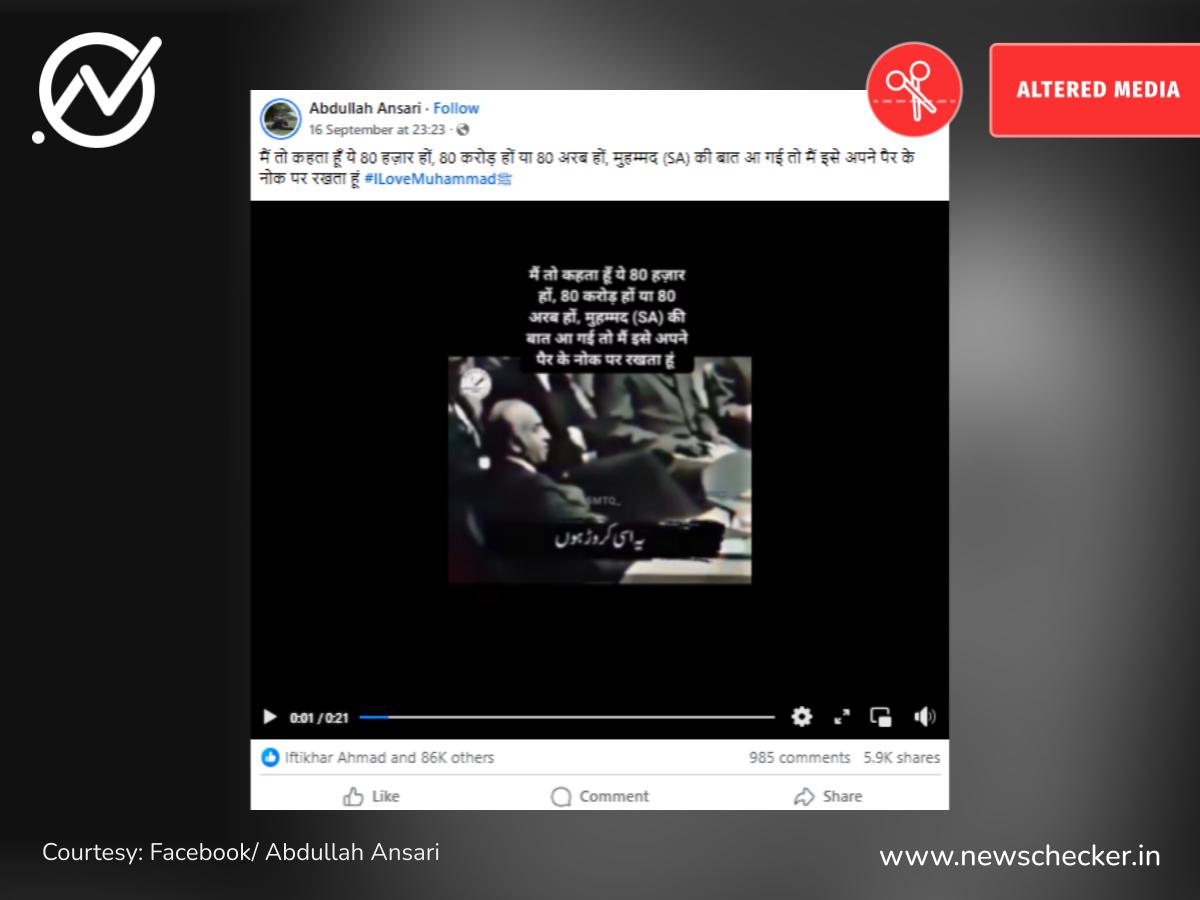 سوشل میڈیا پر وائرل ویڈیو میں پاکستان کے سابق وزیر اعظم و صدر ذوالفقار علی بھٹو کی ایک ویڈیو کے ساتھ یہ دعویٰ کیا گیا کہ انہوں نے امریکہ میں اپنے ایک بیان میں کہا تھا ’’چاہے 80 ہزار ہوں یا 80 ارب، محمدؐ کی بات آئے تو سب کو اپنے پیروں کی نوک پر رکھتا ہوں‘‘، لیکن یہ دعویٰ درست نہیں ہے۔ ویڈیو ترمیم شدہ ہے اور دراصل بھٹو کی 15 دسمبر 1971 کو اقوامِ متحدہ میں کی گئی تقریر کی ہے، جس میں ایسا کوئی جملہ موجود نہیں۔ پورا فیکٹ چیک یہاں پڑھیں۔