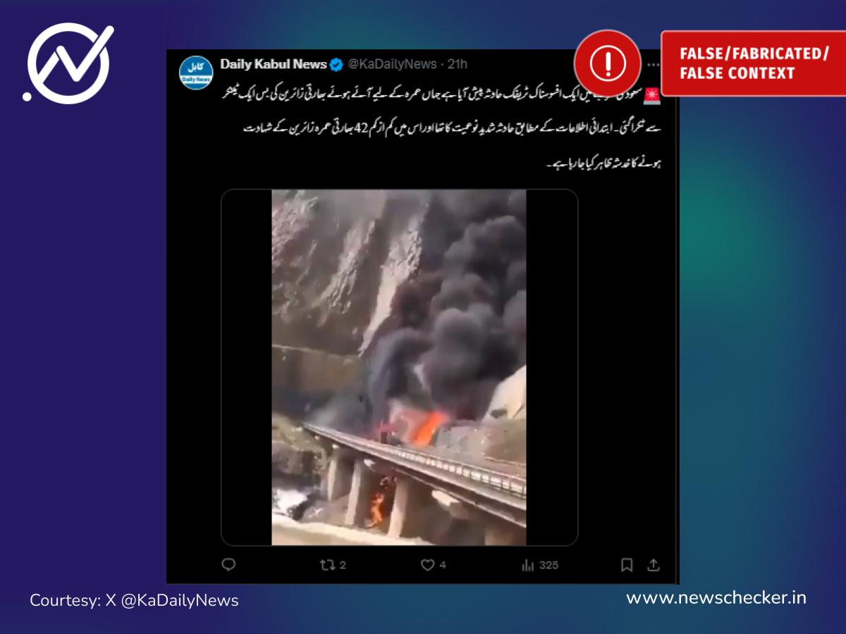 اس ہفتے سوشل میڈیا پر بھارتی عمرہ زائرین کے بس حادثے کے طور پر وائرل کی جانے والی ویڈیو دراصل پرانی ہے، اور یہ مکہ-مدینہ روٹ کی نہیں بلکہ أبھا کے عقبہ شعار میں تیل کے ٹینکر میں لگنے والی آگ کی ہے۔ مکمل فیکٹ جیک یہاں پڑھیں۔