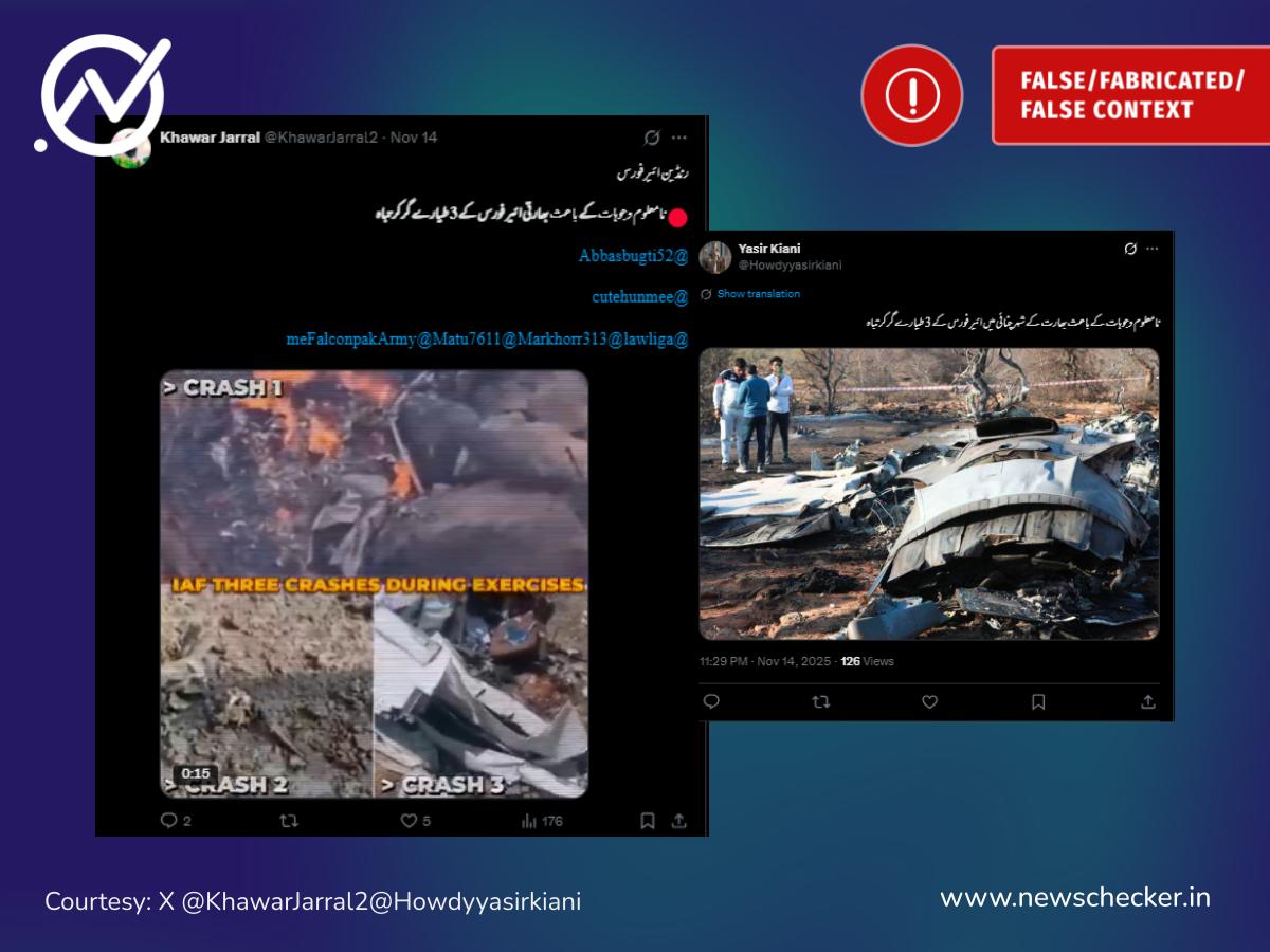 سوشل میڈیا پر دعویٰ کیا گیا کہ چنئی میں بھارتی فضائیہ کے تین طیارے ایک ہی وقت میں کریش ہو گئے، مگر حقیقت یہ ہے کہ چنئی میں صرف ایک ٹرینر طیارہ حادثے کا شکار ہوا تھا، جبکہ گردش کرنے والی تصاویر اور ویڈیوز یا تو پرانی ہیں یا پھر مختلف مقامات کے واقعات سے جوڑ کر گمراہ کن طور پر پیش کی جا رہی ہیں۔ مکمل فیکٹ چیک یہاں پڑھیں۔