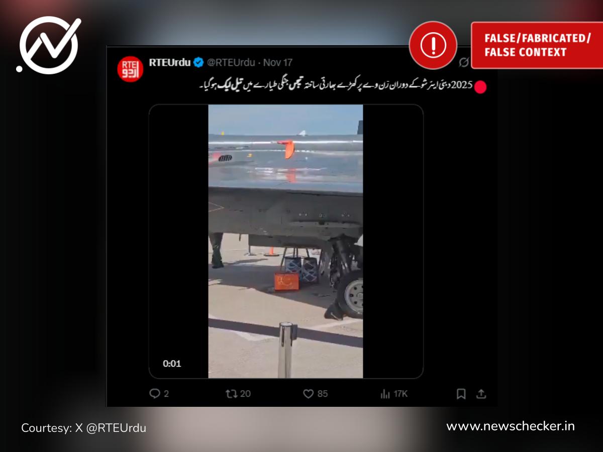 دبئی ایئر شو 2025 کے دوران ایک ویڈیو وائرل ہوئی جس میں دعویٰ کیا گیا کہ بھارتی تیجس لڑاکا طیارے سے تیل لیک ہو رہا ہے، حالانکہ حقیقت یہ ہے کہ ویڈیو میں نظر آنے والا مادہ تیل نہیں بلکہ طیارے کے نظام سے خارج ہونے والا معمول کا پانی ہے۔ پوری حقیقت یہاں پڑھیں۔