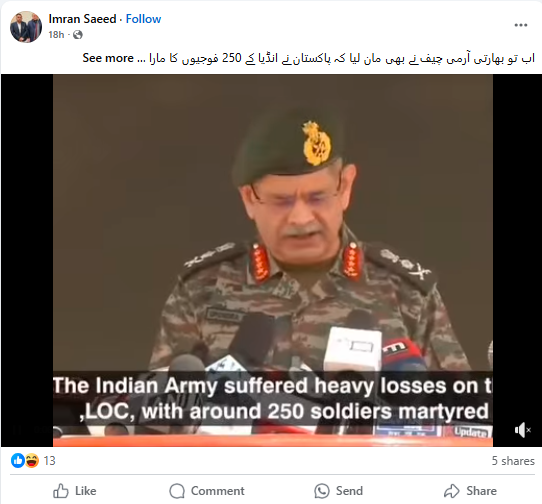 15 سیکنڈ کی اس ویڈیو میں بھارتی آرمی چیف جنرل اوپیندر دویدی کو یہ کہتے ہوئے سنا جا سکتا ہے کہ “ایل او سی پر بھارتی فوج کو بھاری نقصان اٹھانا پڑا، 250 کے قریب ہمارے جوان شہید ہوئے اور ہمارے وسائل کی پوری نقل و حرکت پر پاکستانی اور چینی سیٹلائٹ کڑی نظر رکھے ہوئے تھے”۔ اب اسی ویڈیو کے ساتھ صارف نے کیپشن میں لکھا ہے کہ “اب تو بھارتی آرمی چیف نے بھی مان لیا کہ پاکستان نے انڈیا کے 250 فوجیوں کا مارا۔ اگر کوئی نہیں مان رہا تو وہ ہیں یوتھیے”۔