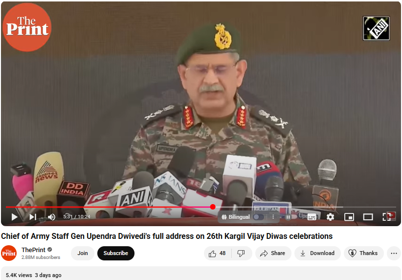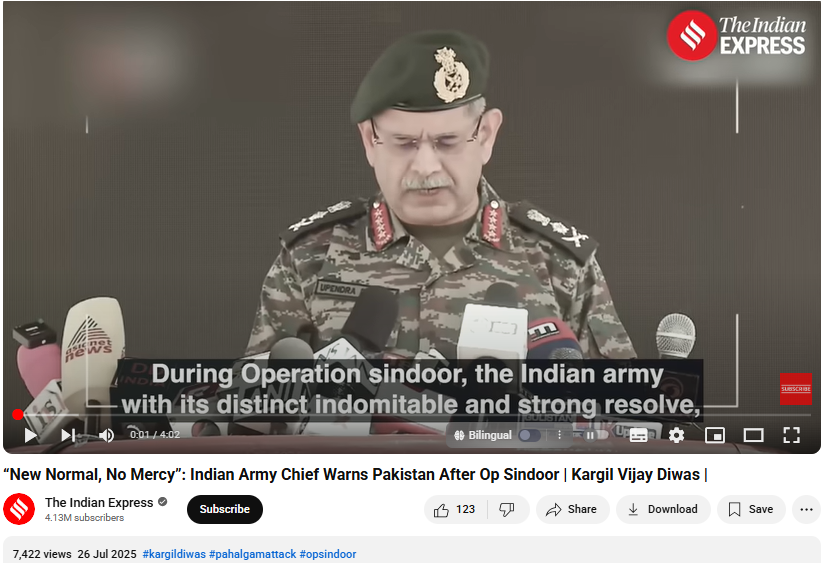 ہم نے جنرل اوپیندر دویدی کے آپریشن سندور میں 250 فوجیوں کی شہادت والے بیان کی تحقیقات کا آغاز کیا۔ ہم نے سب سے پہلے انڈین ایکسپریس کے یوٹیوب چینل کو کھنگالا۔ اس دوران ہمیں ہوبہو وائرل کلپ کا طویل ورژن 26 جولائی 2025 کو اپلوڈ شدہ اس چینل پر موصول ہوا۔ ویڈیو کے ساتھ موجود تفصیل میں لکھا ہے کہ کارگل وجے دیوس کے موقع پر آرمی چیف جنرل اوپیندر دویدی نے دراس میں واقع کارگل وار میموریل میں یہ تقریر کی تھی۔