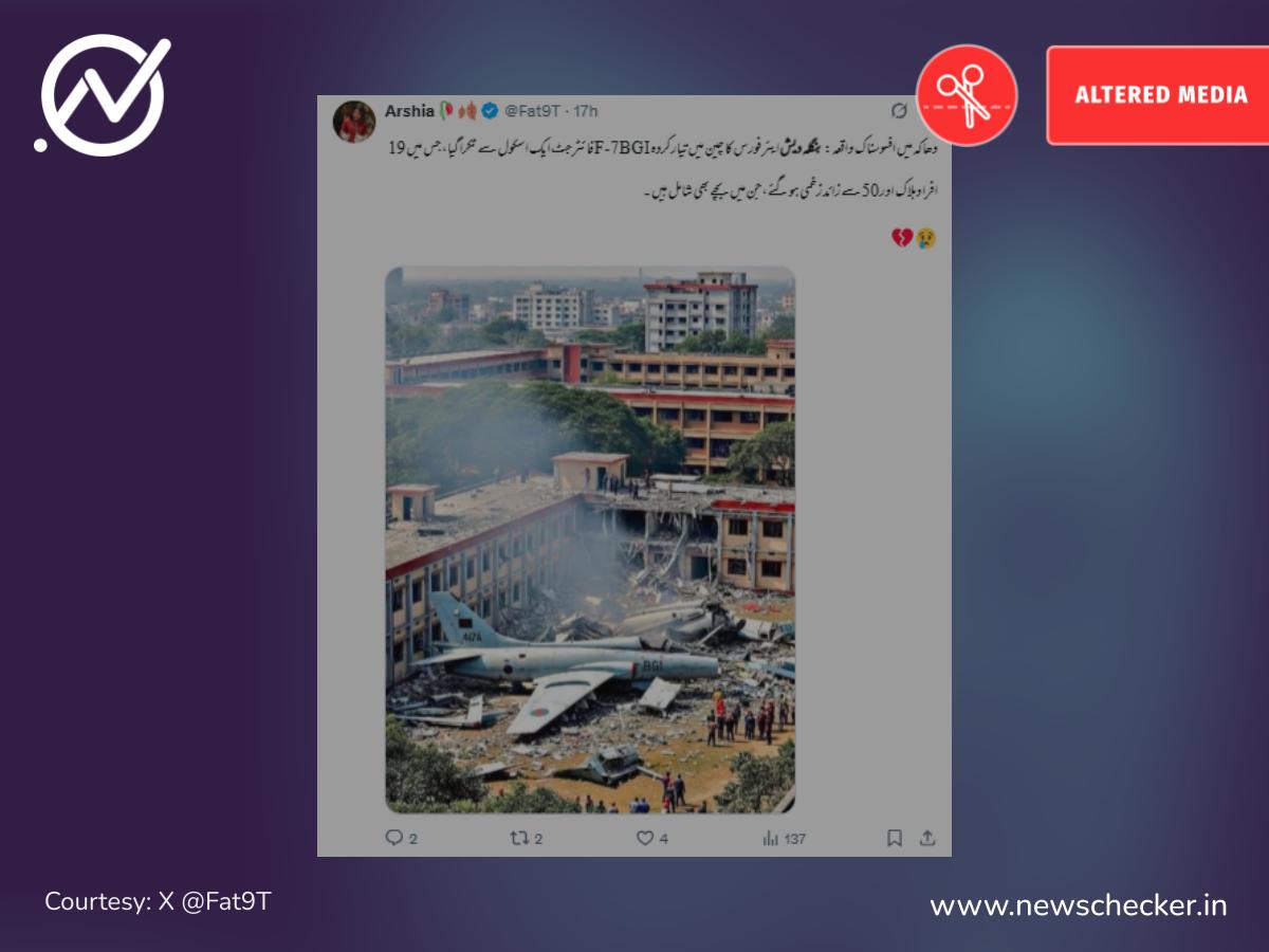 تباہ شدہ طیارے کی ایک تصویر کے ساتھ دعویٰ کیا گیا کہ یہ تصویر بنگلہ دیشی جنگی طیارہ ایف-7 بی جی آئی کے حادثے کی ہے۔ لیکن ہماری تحقیقات سے معلوم ہوا یہ مصنوعی ذہانت کی مدد سے تیار کی گئی ہے۔ یہاں پڑھیں پوری تحقیقات۔