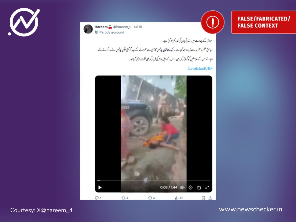 سوشل میڈیا پر دعویٰ کیا گیا کہ بھارتی پولس کی گاڑی سے ٹکرا کر نیچے گری خاتون کی مدد کے بجائے پولس ان کے اہل خانہ کو گرفتار کر رہی ہے۔ ویڈیو امبیڈکر نگر کا ہے جہاں دو گروپوں کے درمیان زمین تنازعہ میں پولس و ملزمین کے مابین جھڑپ ہو گئی تھی۔ مکمل فیکٹ چیک یہاں پڑھیں۔