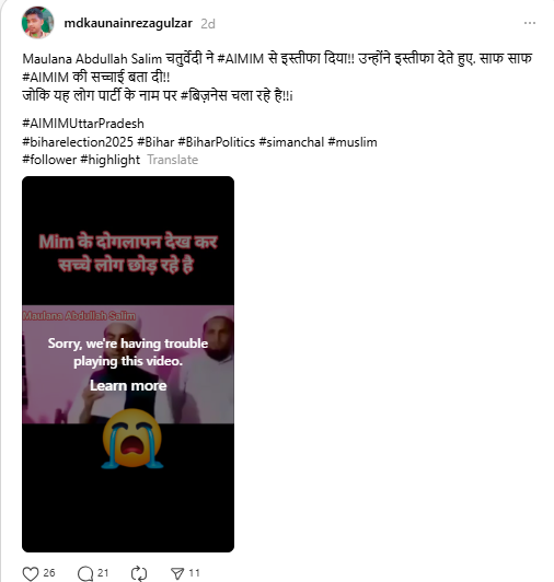 سوشل میڈیا پر مولانا عبد اللہ سالم چترویدی کی ایک ویڈیو شیئر کی جا رہی ہے، جس میں وہ پارٹی سے دستبرداری کی بات کرتے ہوئے سنائی دے رہے ہیں۔ ویڈیو کو حالیہ بہار انتخابات سے منسوب کر کے شیئر کیا جا رہا ہے۔