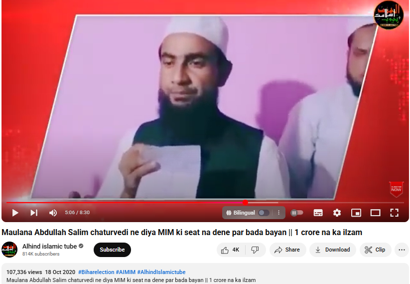 اس کے علاوہ اے آئی ایم آئی ایم نیوز مدھوپور نامی یوٹیوب چینل پر بھی ہمیں وائرل پوسٹ کے حوالے سے ایک ویڈیو موصول ہوئی۔ اس ویڈیو میں بھی مولانا عبد اللہ سالم چترویدی کے استعفیٰ کی خبر کو فرضی بتایا گیا ہے۔