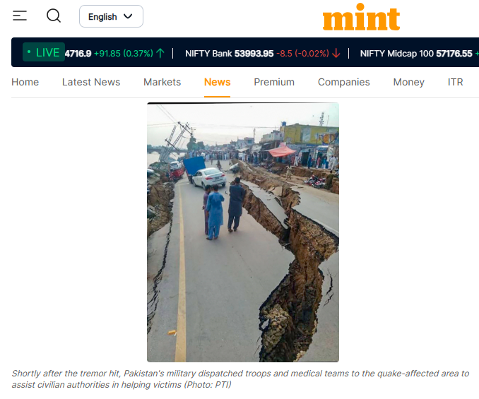اس کے علاوہ ہمیں لائیو منٹ کی 25 اکتوبر 2019 کو شائع ہونے والی بھی ایک رپورٹ ملی۔ اس رپورٹ میں بھی وائرل تصویر کو پاکستان کے میر پور میں زلزلے کی وجہ سے تباہ ہوئی سڑک کا بتایا گیا ہے۔ اس رپورٹ میں مہلوکین کی تعد 37 شمار کی گئی ہے۔