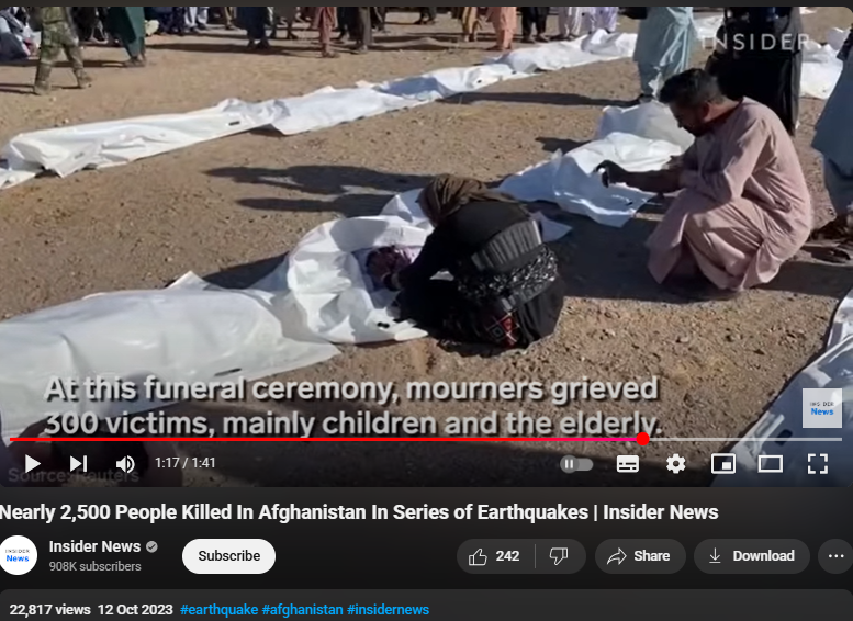 اس حوالے سے انسائیڈر نیوز کے آفیشل یوٹیوب چینل پر 12 اکتوبر 2023 کو اپلوڈ شدہ ایک ویڈیو رپورٹ موصول ہوئی۔ جس میں اجتماعی نماز جنازہ کے مناظر دیکھے جا سکتے ہیں۔ جسے 2023 میں افغانستان میں آنے والے زلزلے میں ہلاک ہوئے لوگوں کے نماز جنازہ کا بتایا گیا ہے۔