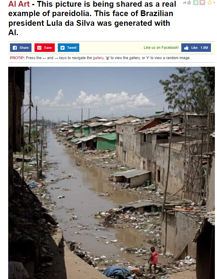 نو یور میم نامی ویب سائٹ کے مطابق وائرل تصویر میں نظر آرہا چہرہ برازیل کے صدر لولا دا سلوا کا ہے۔ جسے اے آئی کی مدد سے تیار کیا گیا تھا۔ یہاں یہ واضح ہو گیا کہ سلم علاقے کی اس تصویر میں عمران خان کا چہرہ نہیں ہے۔