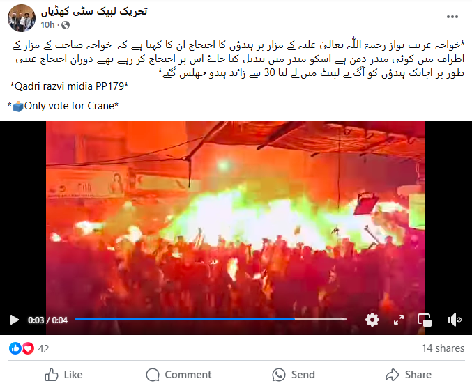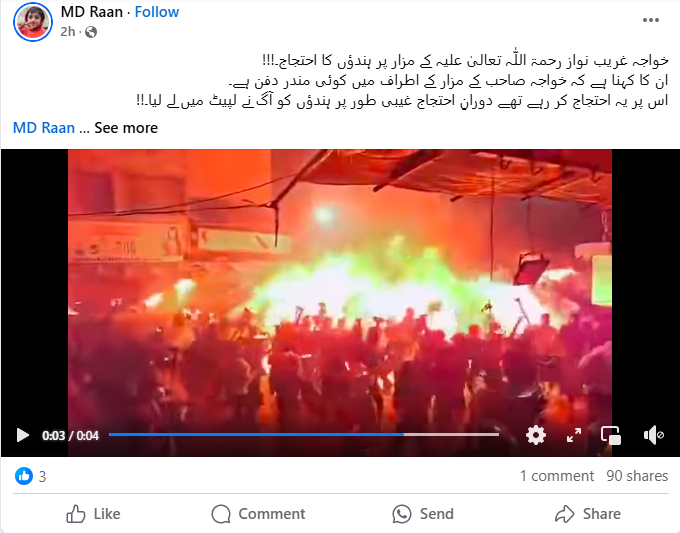 ویڈیو کے ساتھ ایک صارف نے کیپشن میں لکھا ہے “خواجہ غریب نواز رحمۃ اللّٰہ تعالیٰ علیہ کے مزار پر ہندوؤں کا احتجاج ۔ ان کا کہنا ہے کہ خواجہ صاحب کے مزار کے اطراف میں کوئی مندر دفن ہے، اس پر یہ احتجاج کر رہے تھے۔ دورانِ احتجاج غیبی طور پر ہندوؤں کو آگ نے لپیٹ میں لے لیا”۔