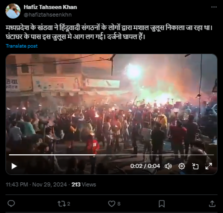 خواجہ معین الدین چشتی کی درگاہ پر مظاہرے کے دوران ہوئے حادثے کا بتاکر شیئر کی جا رہی ویڈیو کے ایک فریم کو ہم نے گوگل لینس پر تلاشا۔ جہاں ہمیں حافظ تحسین نامی ایکس ہینڈل پر 29 نومبر 2024 کو شیئر شدہ ہوبہو ویڈیو موصول ہوئی۔ جس کے ساتھ فراہم کردہ معلومات کے مطابق یہ ویڈیو مدھیہ پردیش کے کھنڈوا کی ہے۔ جہاں مشعل مارچ کے دوران آگ لگنے سے کئی لوگ زخمی ہوگئے۔