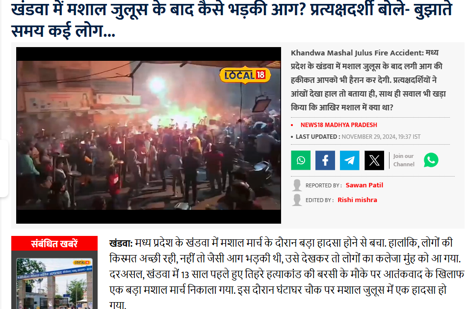 پھر ہم نے گوگل پر “کھنڈوا مشعل مارچ حادثہ” کیورڈ سرچ کیا۔ تب ہمیں مذکورہ وائرل ویڈیو سے متعلق 29 نومبر کو شائع ہونے والی این ڈی ٹی وی اور نیوز18 کی ویب سائٹس پر خبریں موصول ہوئیں۔ ان رپورٹس کے مطابق مدھیہ پردیش کے کھنڈوا میں مشعل مارچ کے دوران مشعل سے تیل گرنے کے باعث شدید آگ بھڑک گئی۔ اس حادثے میں 50 افراد جھلس گئے، جن میں 12 کی حالت تشویشناک ہے۔ سبھی زخمیوں کو ضلع اسپتال میں داخل کرایا گیا ہے۔ حادثہ 26/11 کے شہداء کو خراج تحسین پیش کرنے کے دوران پیش آیا تھا۔