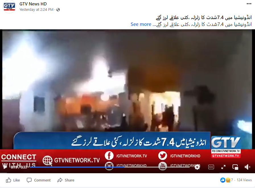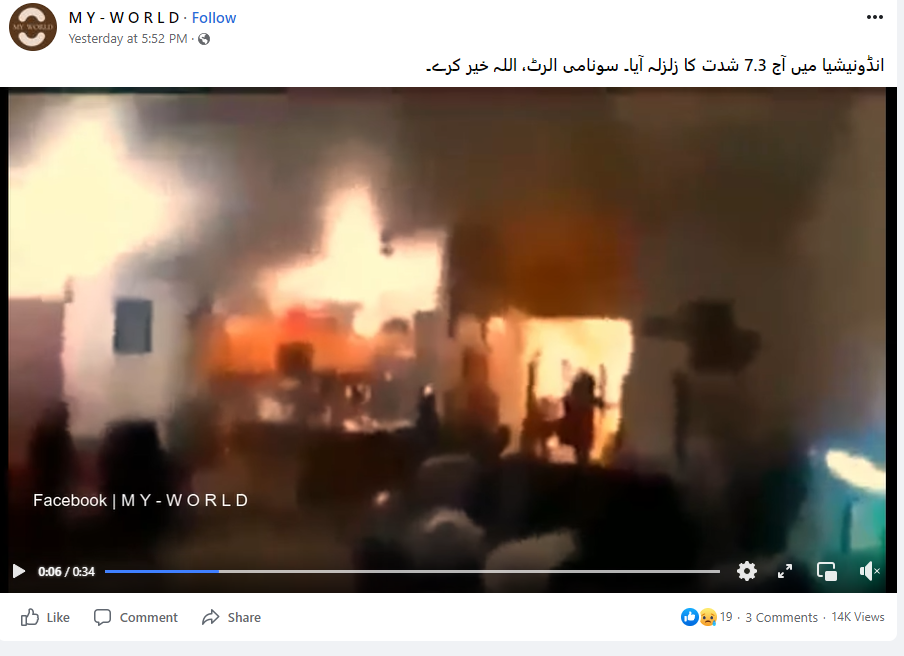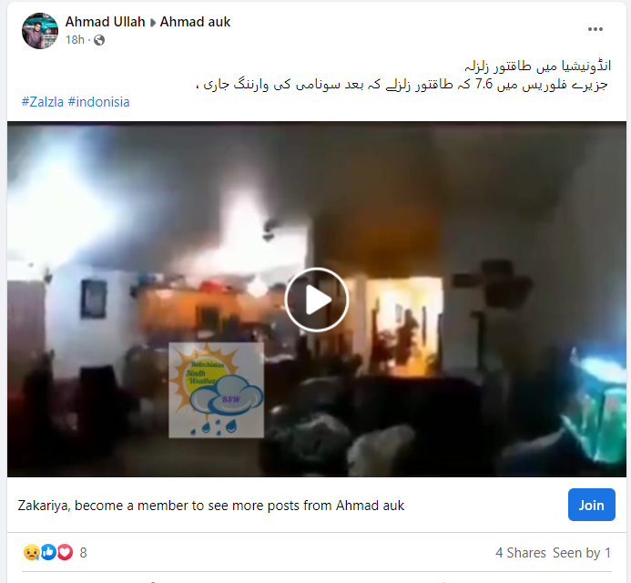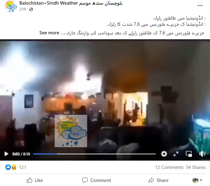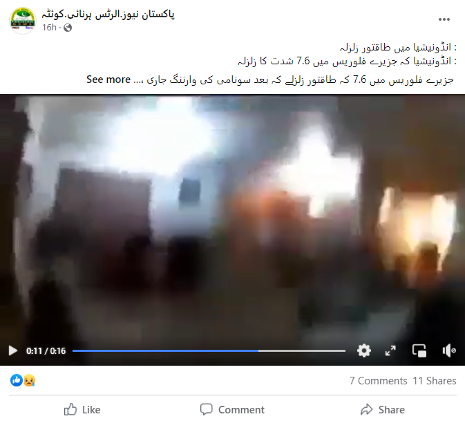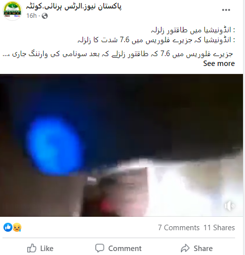 جس کے ساتھ کچھ فیس بک صارفین نے کیپشن میں لکھا ہے کہ “انڈونیشیا کہ جزیرے فلوریس میں 7.6 شدت کا زلزلہ، جزیرے فلوریس میں 7.6 کہ طاقتور زلزلے کہ بعد سونامی کی وارننگ جاری کی گئی ہے زلزلہ فلوریس جزیرے کہ سمندر میں 76 کلو میٹر گہرائی میں آیا، زلزلے سے سونامی کا خطرہ پیدا ہوگیا ہے، جن علاقوں میں زلزلے کہ جھٹکے محسوس کیے گئے ہیں وہاں سے فی الحال جانی ومالی نقصان کی اطلاع نہیں ہے”۔