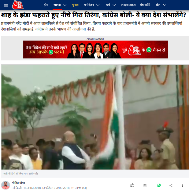 آج تک نے اپنی رپورٹ میں وائرل ویڈیو کے اسکرین شارٹ کو فیچر امیجز کے طور پر استعمال کیا ہے۔ رپورٹ میں لکھا ہے کہ 15 اگست 2018 کو 72 ویں یوم آزادی کے موقع پر بھارتیہ جنتا پارٹی کے قومی صدر امت شاہ نے پرچم کشائی کی۔ اس دوران جیسے ہی امت شاہ نے ترنگا لہرانے کے لئے رسی کھینچی تو ترنگا نیچے گر گیا۔ کانگریس پارٹی نے ایکس پر اس واقعہ کا ویڈیو شیئر کرکے بی جے پی کو نشانہ بنایا۔