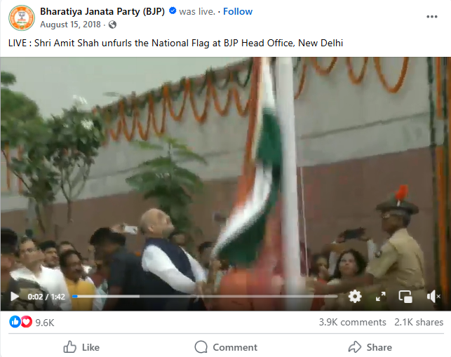 مزید تحقیقات کے دوران ہمیں اس واقعے کا لائیو اسٹریم ویڈیو 15 اگست 2018 کو بی جے پی کے فیس بک اکاؤنٹ سے ملا، ویڈیو میں دیکھا جا سکتا ہے کہ رسی کھینچتے وقت بھارتی قومی پرچم گر جاتا ہے، تاہم امت شاہ فوراً رسی کو صحیح کرتے ہیں اور اسے کھینچ کر جھنڈا لہراتے ہیں۔ یہ ویڈیو اصل میں 15 اگست 2018 کو بی جے پی کے مرکزی دفتر (نیشنل ہیڈکواٹر) پر ترنگا لہرانے کے دوران پیش آئے واقعے کی ہے۔