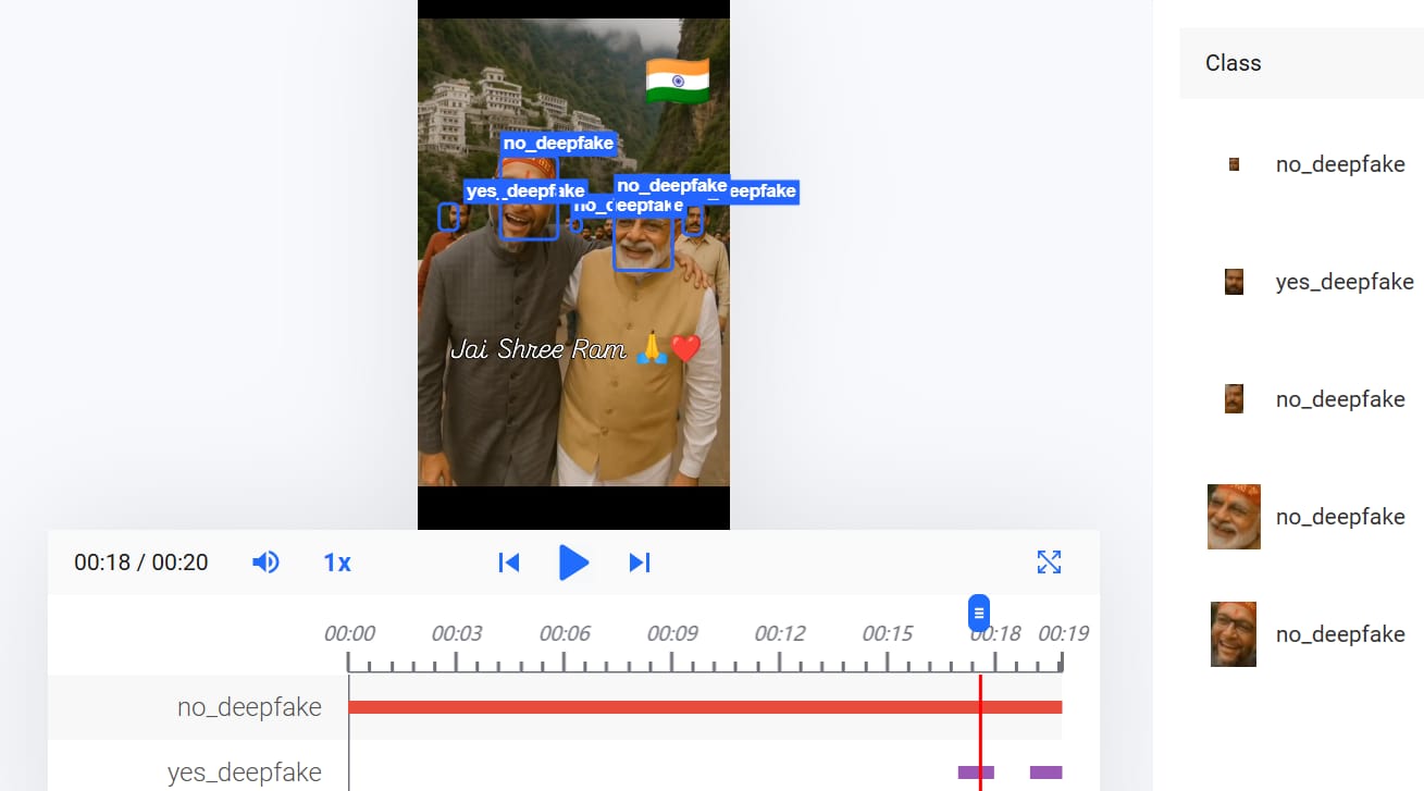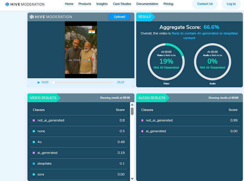 اس کے علاوہ ہائیو اے آئی کی مدد سے بھی ویڈیو کے مختلف کیفریم کی جانچ کی۔ ویڈیو کے آخر کے فریم میں پیچھے موجود افراد کے چہرے مودی اور اویسی سے ملتے ہوئے نظر آ رہے ہیں۔ جس کے باعث اس نے بھی اسے ڈیپفیک بتایا ہے۔