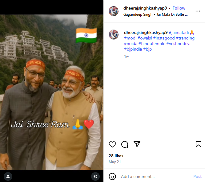 سوشل میڈیا پر اسدالدین اویسی اور نریندر مودی کی ایک ویڈیو شیئر کی گئی ہے، جس میں اویسی اور وزیر اعظم مودی ایک دوسرے کے کاندھے پر ہاتھ رکھے ہوئے نظر آ رہے ہیں۔ ویڈیو میں ایک بھجن بھی سنائی دے رہا ہے، جس پر اویسی لِپ سنگ کر رہے ہیں اور ان دونوں کے ماتھوں پر پٹی بندھی ہوئی بھی نظر آ رہی ہے۔ ویڈیو میں یہ دونوں جموں کے ویشنو دیوی مندر جاتے ہوئے دکھائی دے رہے ہیں۔