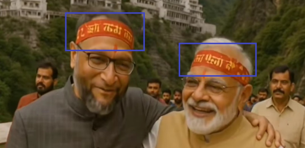 اسدالدین اویسی اور نریندر مودی کی شیئر کردہ اس ویڈیو کی تحقیق کے لئے ہم نے سب سے پہلے ویڈیو کا بغور تجزیہ کیا۔ اس دوران ہم نے دیکھا کہ ان کے ماتھے پر موجود پٹی میں لکھے ہندی حروف بےترتیب ہیں۔ ساتھ ہی ان کے چہروں کے تاثرات بھی غیر معمولی ہیں۔ اس کے علاوہ ان کے پیچھے چل رہے شخص کی شرٹ کا رنگ بھی تھوڑے وقفے میں بدل رہا ہے۔