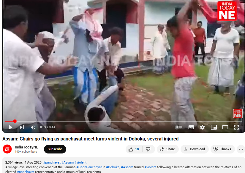 بہار میں اے آئی ایم آئی ایم سے جیت کے بعد آر جے ڈی میں شامل ہوئے ایم ایل اے کے لئے ووٹ مانگنے آئے سرپنچ کی گاؤں والوں کی جانب سے کی گئی پٹائی کا بتاکر شیئر کی گئی ویڈیو کے چند فریم کو سب سے پہلے ہم نے گوگل لینس کی مدد سے تلاش کیا۔ اس دوران ہمیں یہی ویڈیو انڈیا ٹوڈے این ای کے یوٹیوب چینل پر ہوبہو ویڈیو ملی۔ جسے 4 اگست 2025 کو شائع کیا گیا تھا۔ جسے آسام کے ڈوبوکا میں ایک گرام پنچایت کی میٹنگ کے پر تشدد ہو جانے کا بتایا گیا ہے۔